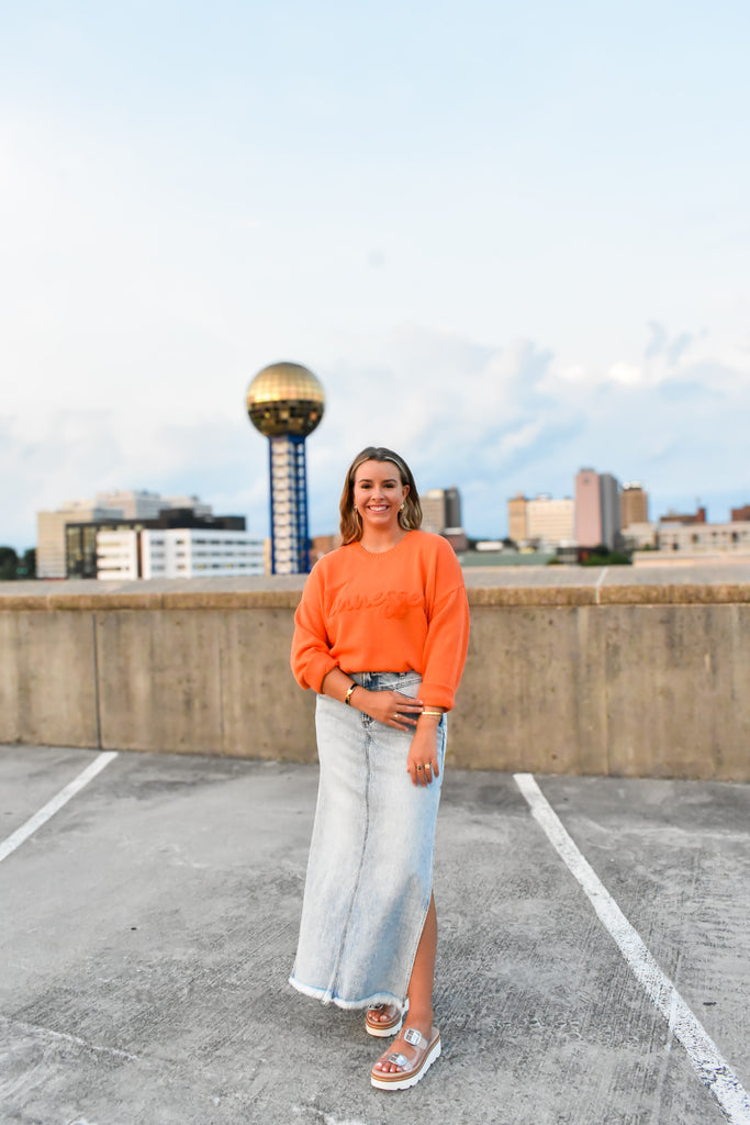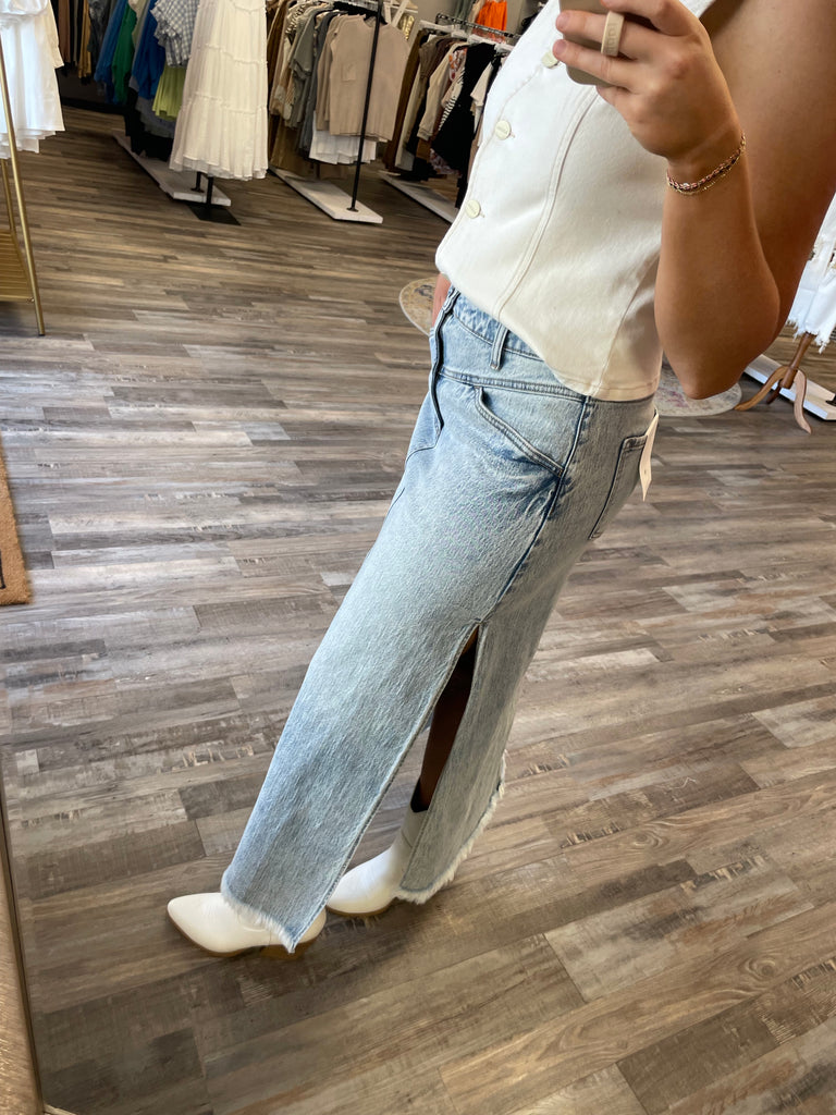 Mid rise denim midi skirt. Light washed denim with a slit on both sides and front pockets. Runs true to size, model is wearing a medium.