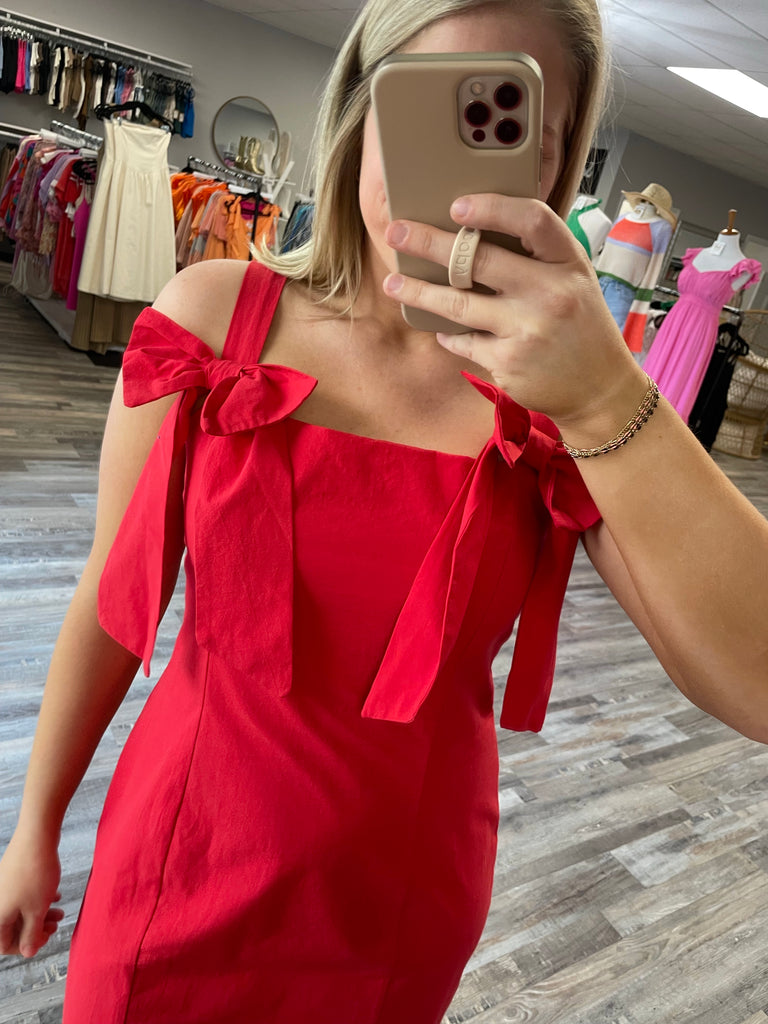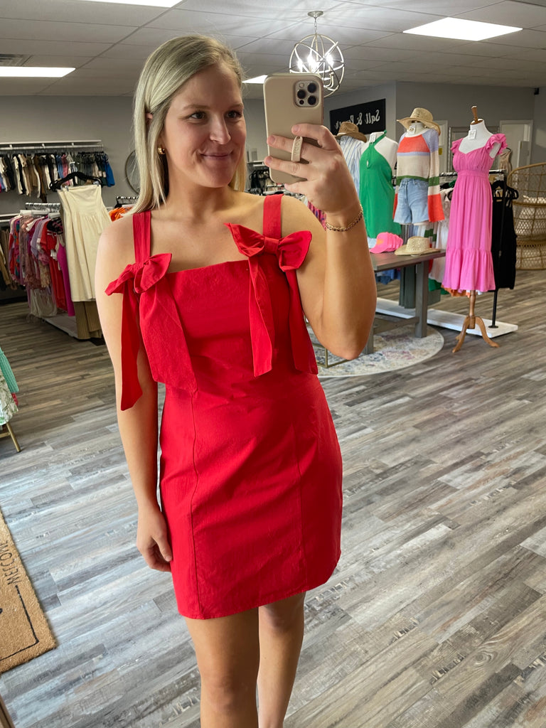 The sweetest dress! Red aline dress with a square neckline. Bow detail on both straps with a zipper closure in the back. Runs smaller through the hips, if you are in between sizes, recommend sizing up. Model is wearing a large